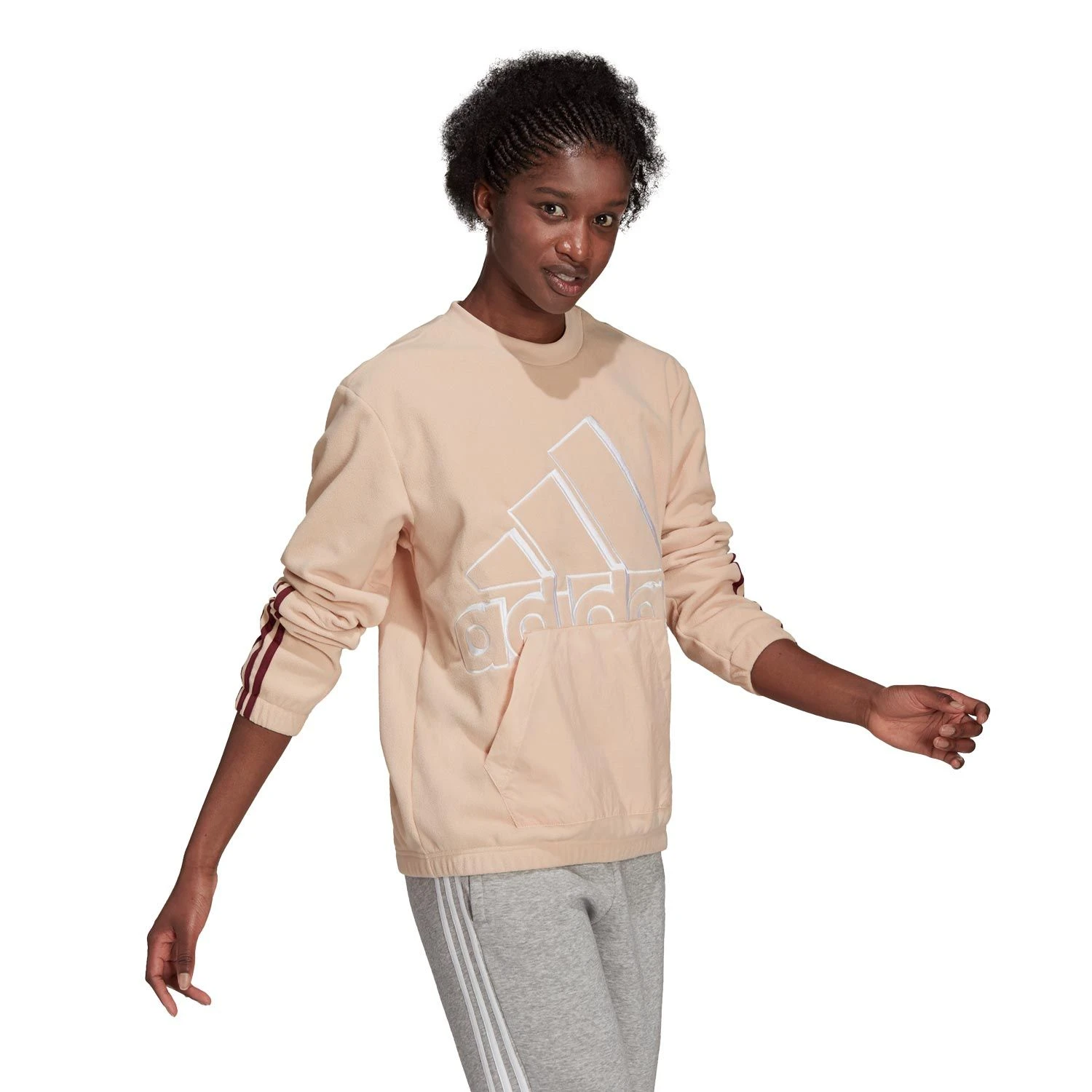 Dieses adidas Sweatshirt ist alles andere als Standard. Dafür sorgen das angeraute Polarfleece und die Crinkle-Optik. Das extragroße adidas Logo auf der Vorderseite versprüht dabei sportlichen Vibe. Und natürlich darf für den perfekten Tragekomfort auch eine Kängurutasche nicht fehlen.